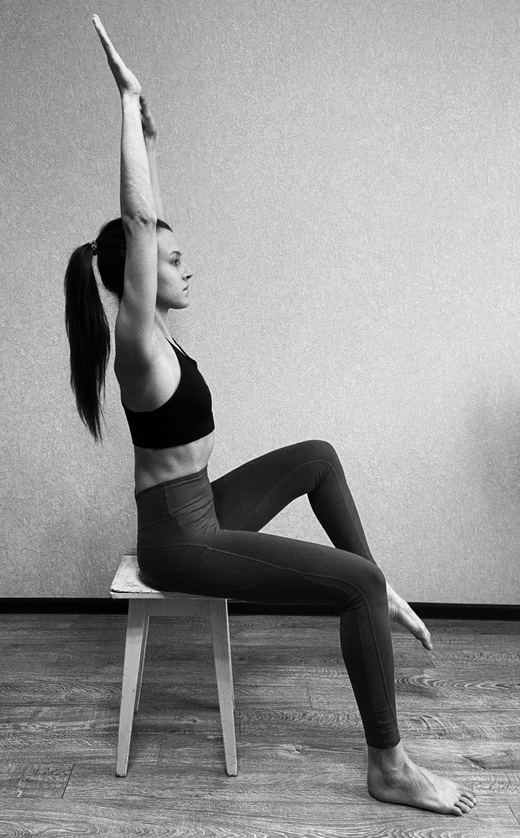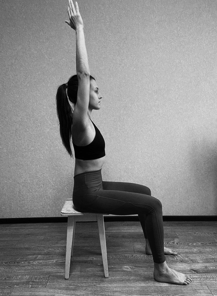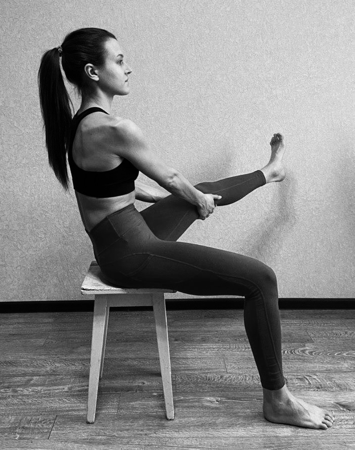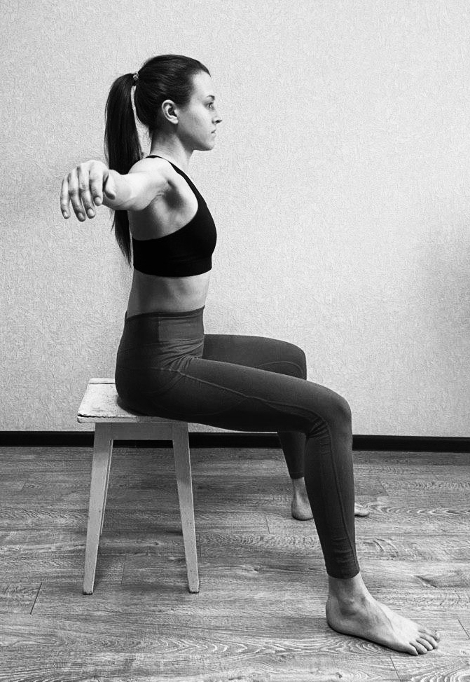 И.П. - сидя на стуле,руки опущены, ноги согнуты.