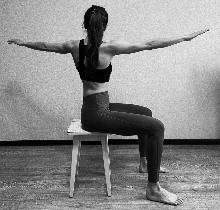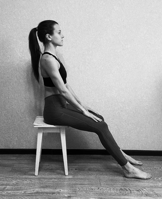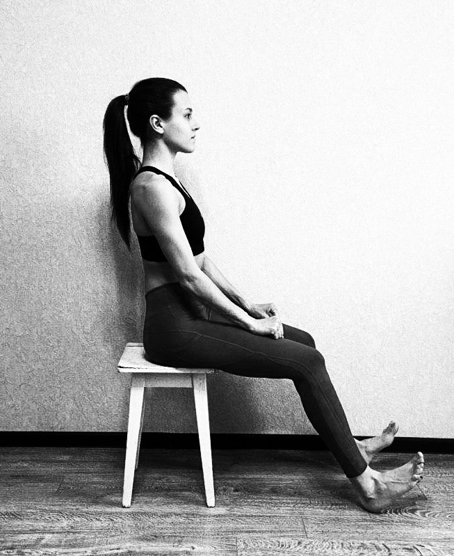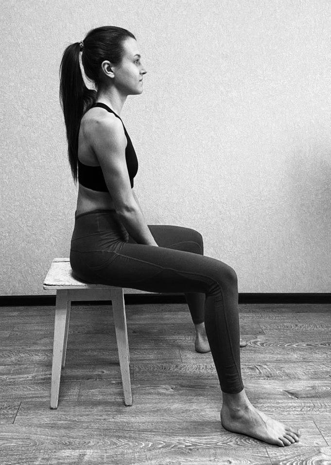 И.П. (исходное положение) сидя на стуле, руки на бедрах, ноги выпрямлены.