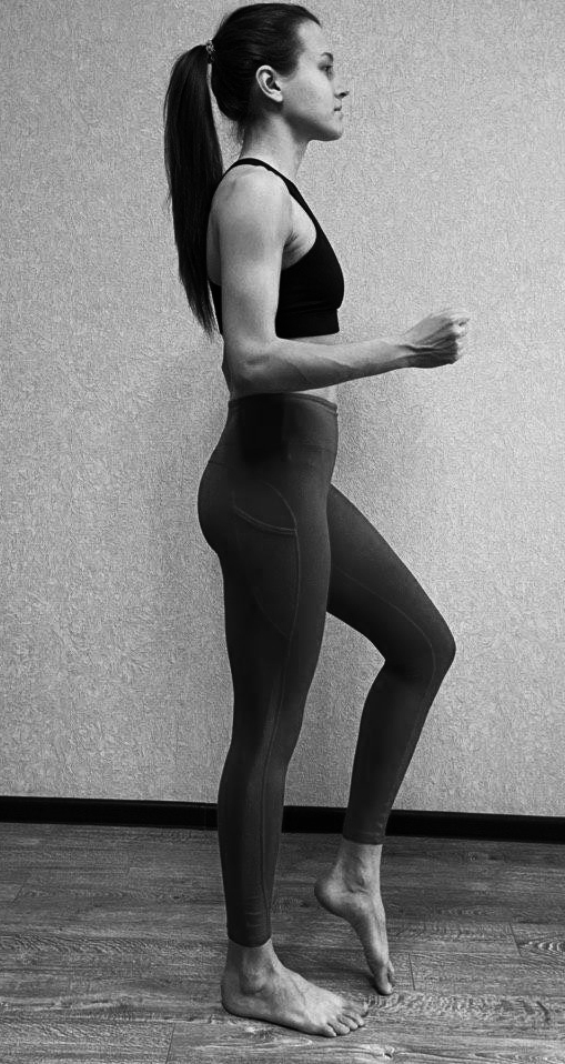 Ходьба на месте. Колено приподнимаем, но высоко.